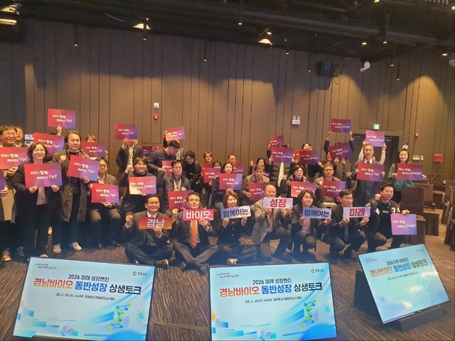 경상남도는 25일 김해중소기업비즈니스센터에서 동부경남(김해·양산)지역 바이오기업인들과 함께 ‘2026 미래 성장엔진 경남바이오 동반성장 상생토크’를 열었다.