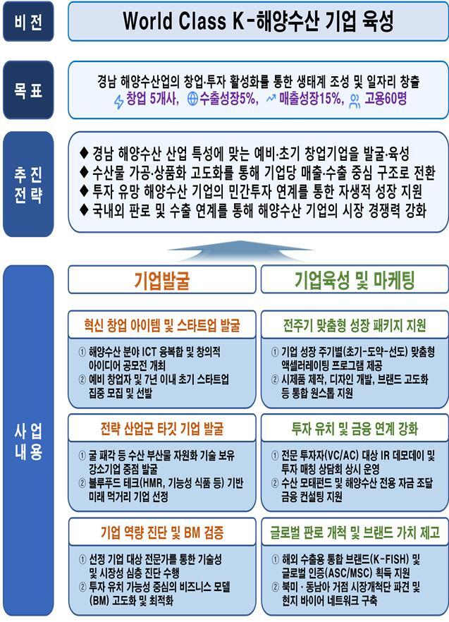 해당 사업은 (재)경남테크노파크가 주관하고 (재)경남항노화연구원이 참여기관으로 함께 수행한다. 올해 사업비 15억 원(국비 7.5억 원, 도비 7.5억 원)을 투입해 유망 해양수산 기업의 창업부터 투자유치, 글로벌 시장 진출까지 전 과정을 지원한다.